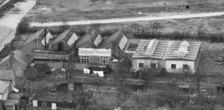From historic Ordnance Survey maps the factory was constructed sometime between 1904 and 1956 but not much else was known. Fortunately the factory appears in the corner of an early aerial photograph from 1927, helping to place it into the first quarter of the 20th Century. It appears again in an 1946 aerial photograph , which showed it had expanded and a sign is visible on the side of the building which read ‘Dalmas Products’.